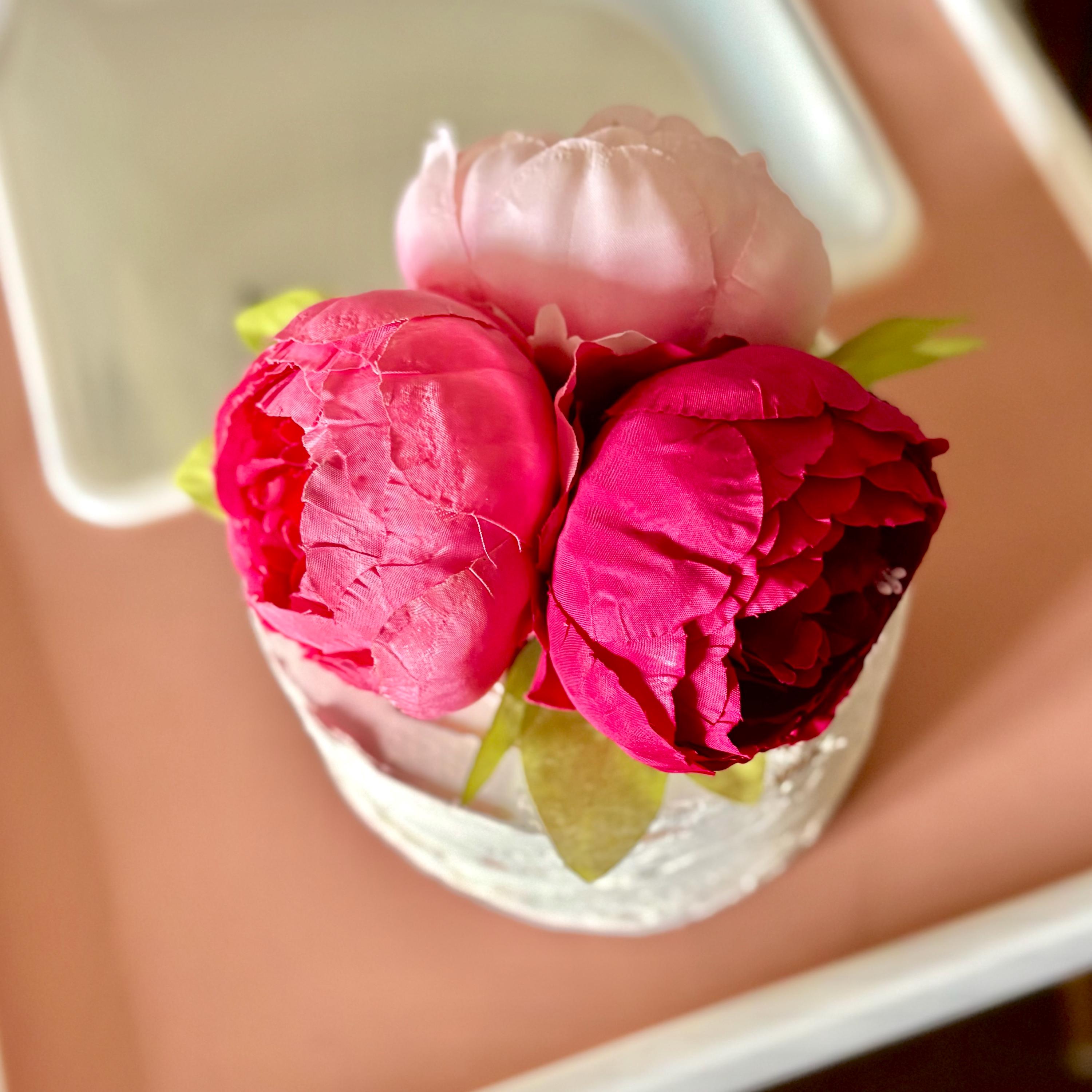Made of faux peonies and faux greenery.